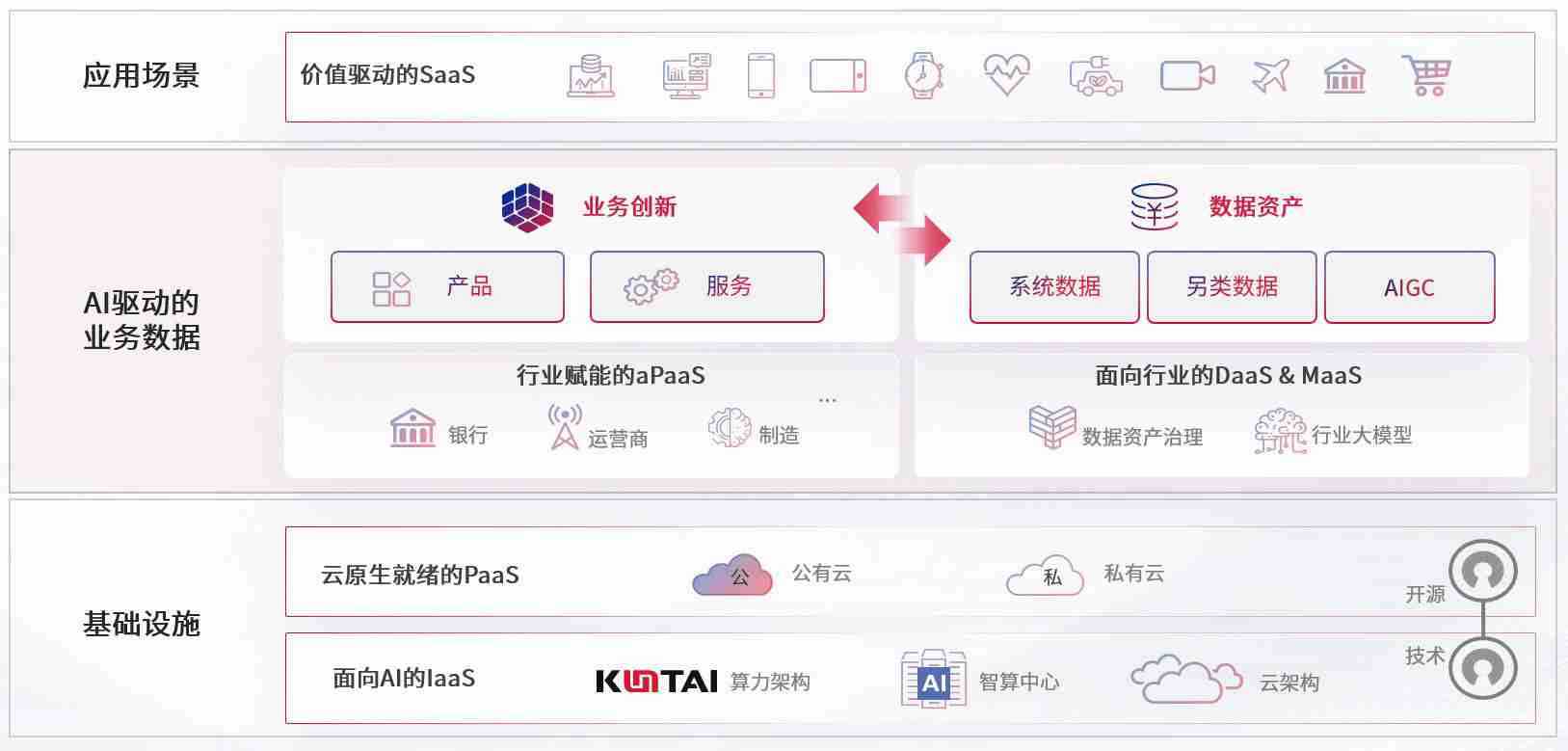 数字时代,,,,围绕企业数字化转型的关键要素,,,,南宫体育数码开创性的提出数云融合战略和技术体系框架,,,着力在云原生、、数字原生、、AI原生和信创产业上架构产品和服务能力,,为处在不同数字化转型阶段的快消零售、、、汽车、、、、金融、、、、医疗、、政企、、教育、、、运营商等行业客户提供泛在的敏捷IT能力和融合的数据驱动能力,,,构建跨界融合创新的数字业务场景和新业务模式,,,助力企业级客户建立面向未来的核心能力和竞争优势,,,全面推动社会的数字化、、、智能化转型升级。。